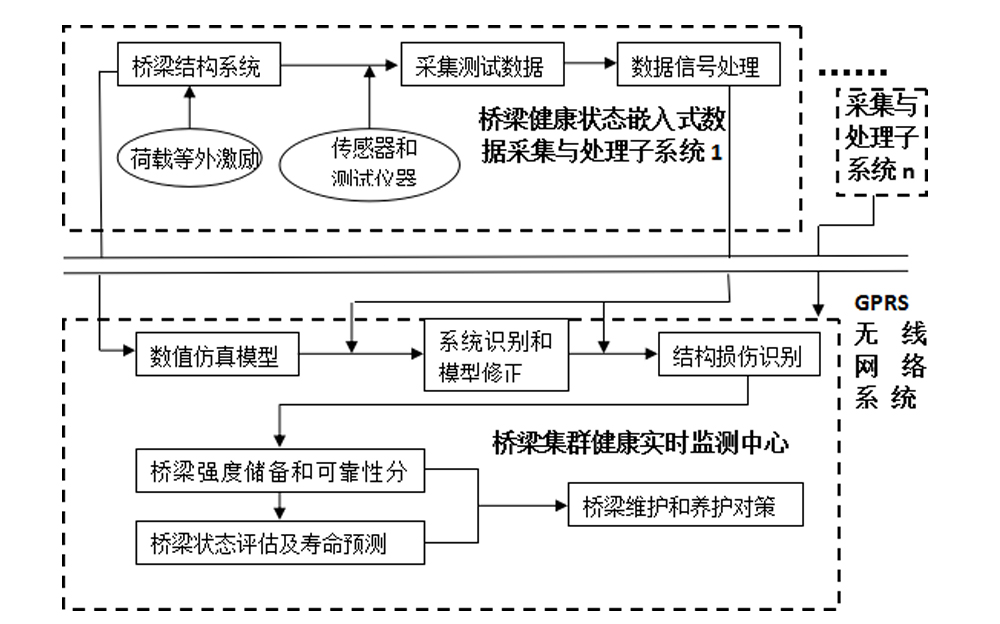 基于GPRS的(de)橋梁集群健康監測系統由多(duō)個(gè)基于ARM微(wēi)處理(lǐ)器(qì)的(de)橋梁健康狀态參數(sh∏ù)采集子(zǐ)系統與一(yī)個(gè)橋梁健康實時(shí)監測中心組成,采集子(zǐ)系統與監測中心之間σ(jiān)通(tōng)過GPRS無線網絡實現(xiàn)數(shù)據交換,可(kě)實現(xiàn)大(dà)區(qū)域面積內(nèi)分(fēn)散分(fēn)布橋梁集 群健康狀況的(de)實時(shí)監測。